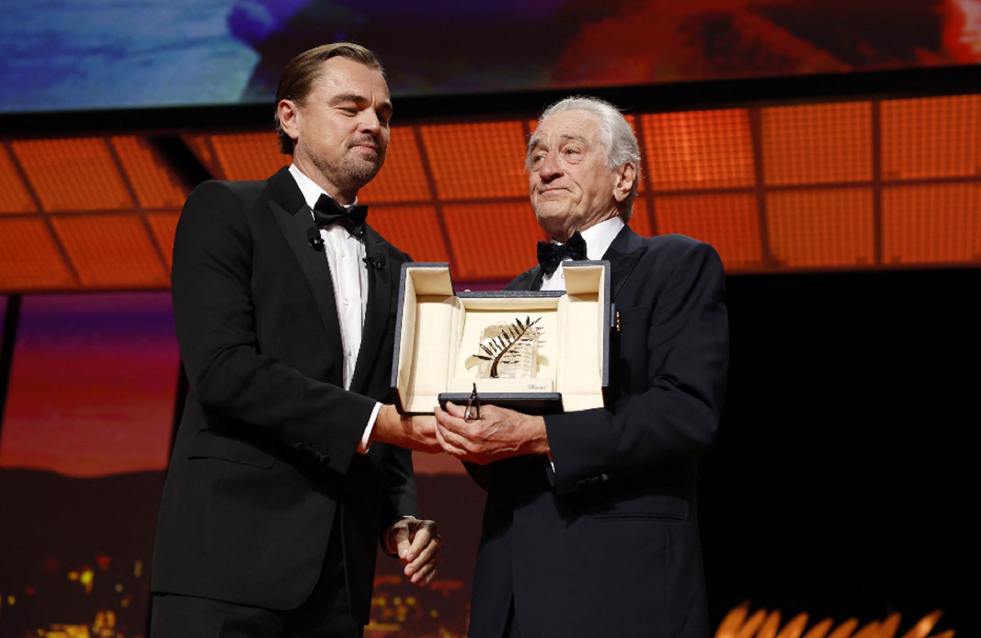 De Niro ricorda la sua prima volta a Cannes, nel 1973 con Taxi Driver e l’ultima 50 anni dopo con Killers of the flower moon, ancora di Scorsese e con DiCaprio a dividere la scena. Abbraccia Leonardo come un padre, lucciconi agli occhi tutti e due (è una foto storica di questa serata) e guarda la platea che si inchina alla leggenda. Ha davanti «la comunità del cinema che Cannes ha saputo creare» e poi smette di cedere all’emozione per fare il discorso che aveva evidentemente preparato, evoca Trump “il presidente ignorante che «ha tagliato i fondi per le discipline umanistiche, per l’istruzione superiore, e ora annuncia dazi doganali sul cinema semplicemente inaccettabili».