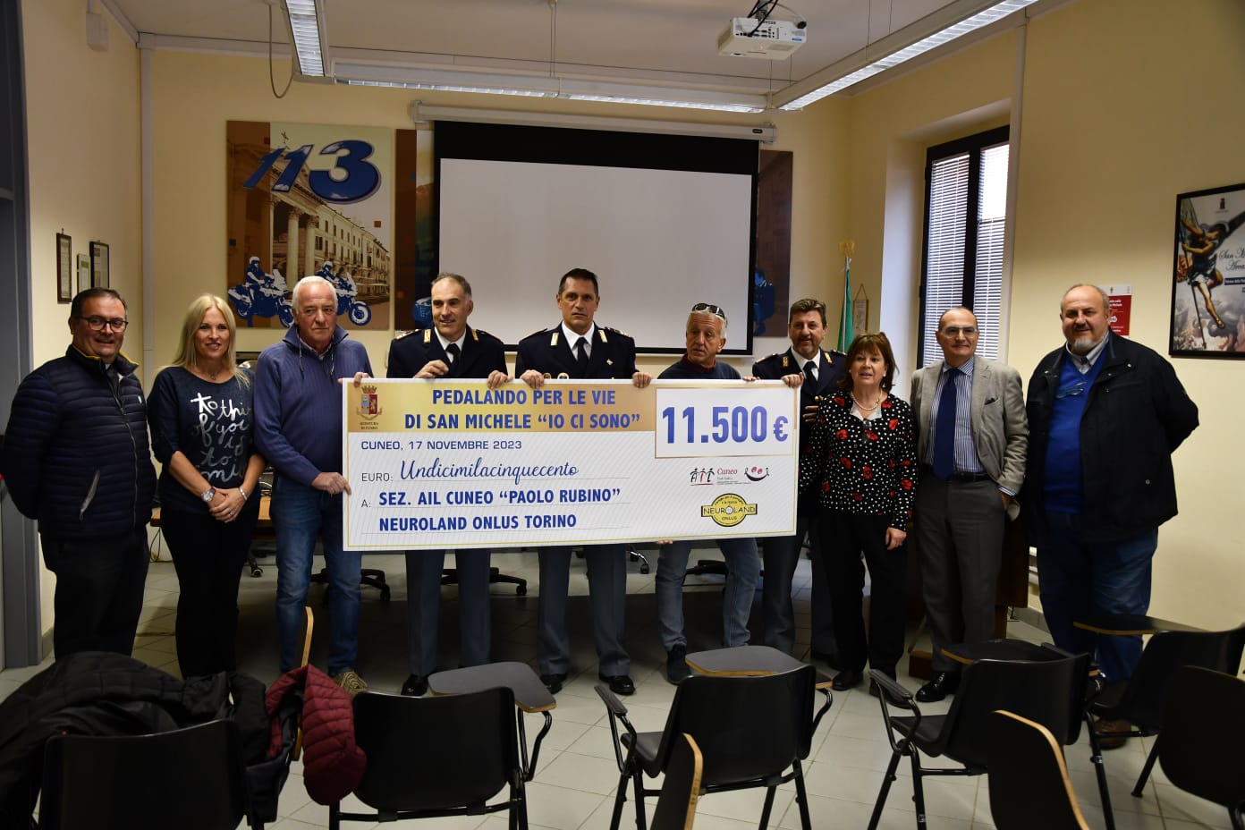 Si è svolta questa mattina nella Sala Cunzolo della Questura di Cuneo, alla presenza del Signor Questore dottor Carmine Rocco Grassi e dell’Assessore allo sport del Comune di Cuneo Valter Fantino, la cerimonia di consegna del ricavato delle donazioni effettuate durante la manifestazione “Pedalando sulle vie di San Michele” (svoltasi dal 17 al 23 settembre 2023) alle associazioni ”Ail” e “Neuroland”.