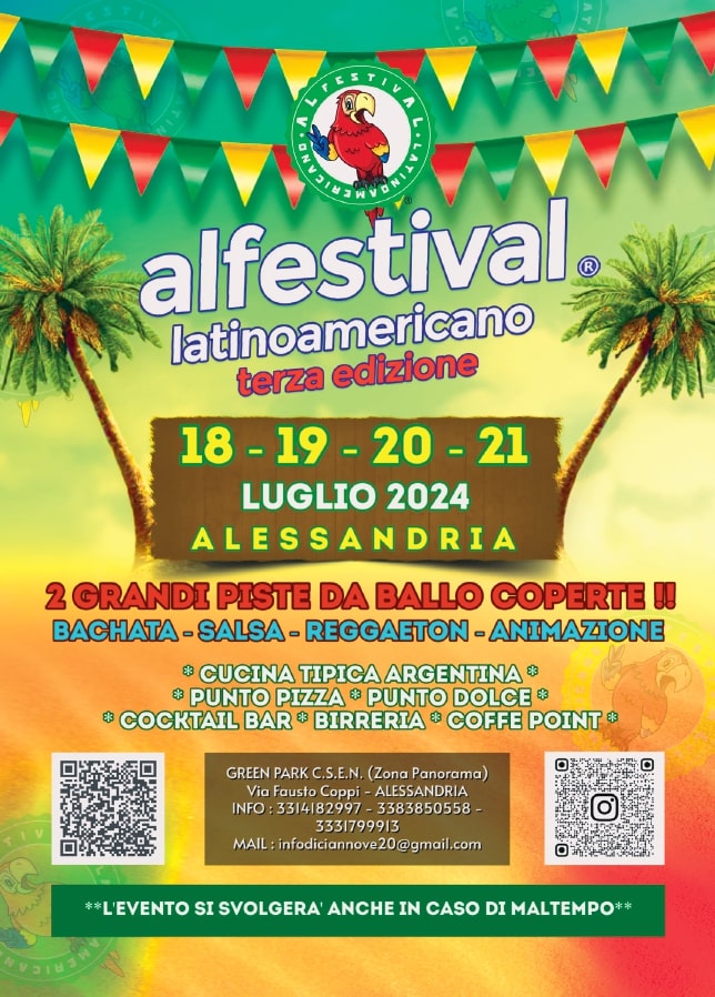 La distruzione di parte delle attrezzature intervenuta a causa di un nubifragio nel 2022, non ha fatto desistere gli organizzatori di “ALFESTIVAL LATINO AMERICANO” che hanno illustrato il programma e le iniziative che animeranno la III edizione, prevista da giovedì 18 a domenica 21 luglio. Quattro serate in uno spazio che per la prima volta in assoluto ospiterà un evento, ovvero il Green Park CSEN in via Fausto Coppi, zona Panorama ad Alessandria.