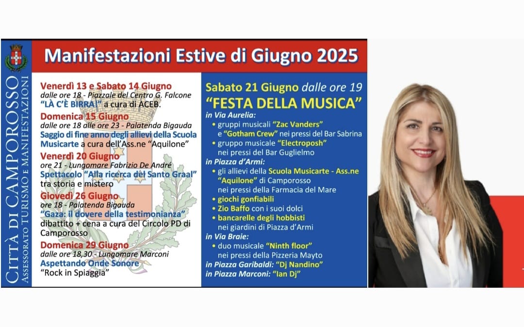 “Si passerà poi al 21 giugno con la prima delle nostre rappresentazioni teatrali all’aperto, ovviamente sul lungomare De Andre’, dal titolo suggestivo: ‘Alla ricerca del sacro Graal’, un misto tra storia e mistero. Un evento da non perdere. Cosi come non si può mancare alla ormai consueta Festa della musica 2025, in calendario la sera del 21 giugno, che sarà sviluppata sul tutto il territorio compreso il nostro centro storico” – svela l’assessore – “Segnalo, per concludere il mese di giugno, la data del 29, sul lungomare Marconi, che inaugura la rassegna musicale ‘Onde Sonore 2025’, che si svilupperà anche lungo tutto luglio e tutto agosto e che vedrà eventi musicali di ogni genere, nelle piazze e nei punti più accoglienti della nostra bellissima città”.