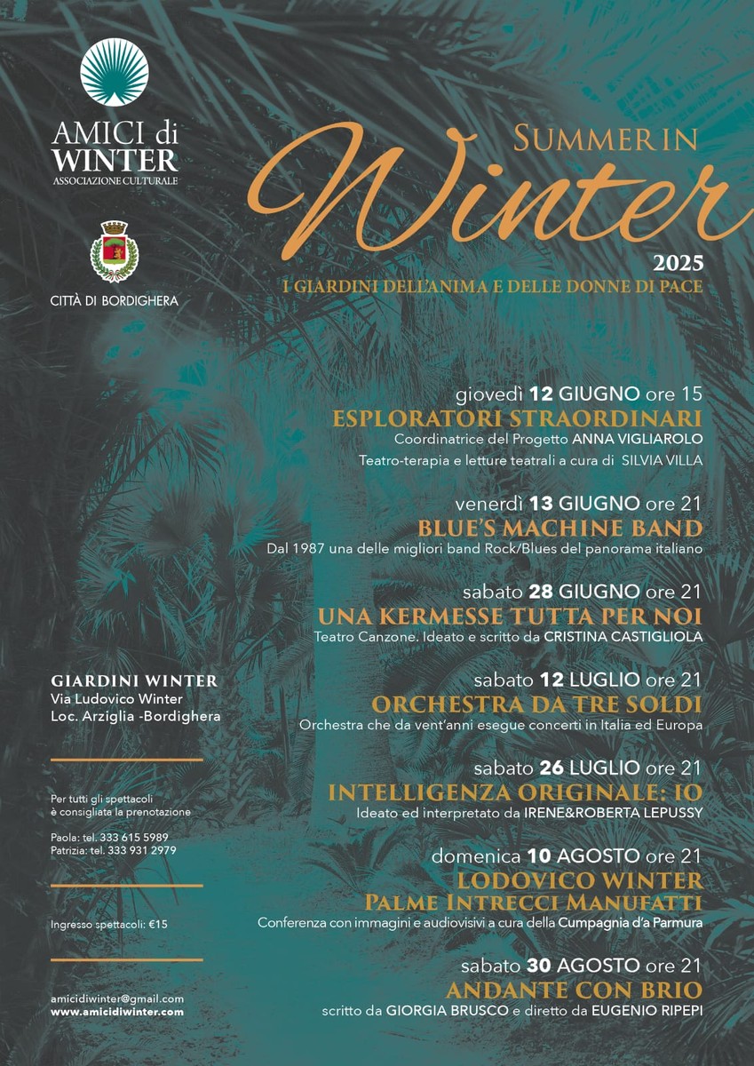 Un’occasione speciale per scoprire in anteprima il programma della nuova edizione di Summer in Winter, la rassegna culturale promossa dall’associazione Amici di Winter, giunta quest’anno alla sua sesta edizione. L’appuntamento è per sabato 7 giugno 2025, alle ore 18.30, presso l’Hotel Piccolo Lido di Bordighera (Lungomare Argentina n. 2), con una serata dedicata alla presentazione del progetto e alla condivisione dei suoi contenuti.