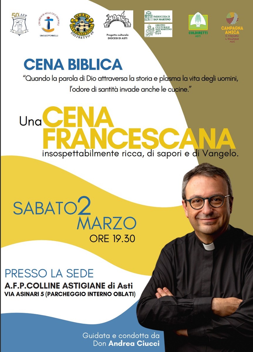 Quattro portate in menù accompagnate dal racconto del prete-cuoco don Andrea Ciucci. La cena biblica è organizzata in collaborazione con gli Oblati di San Giuseppe.