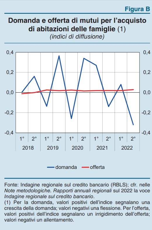 La domanda di mutui per l’acquisto di abitazioni da parte delle famiglie, cresciuta nel semestre precedente, si è contratta nella seconda metà del 2022 per effetto soprattutto dell’aumento dei tassi di interesse. Dal lato dell’offerta gli intermediari hanno segnalato una maggiore prudenza nella concessione dei mutui: a fronte di minori vincoli sulle quantità, gli spread sono aumentati.