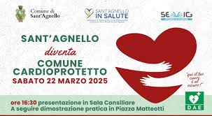 Sabato 22 marzo 2025 si terrà la presentazione ufficiale del progetto “Sant’Agnello, Comune cardioprotetto” con una prima parte informativa alle 16:30 in Sala Consiliare e, a seguire, una seconda parte pratica, con dimostrazione di rianimazione cardiopolmonare e defibrillazione su manichino avanzato, in Piazza Matteotti.