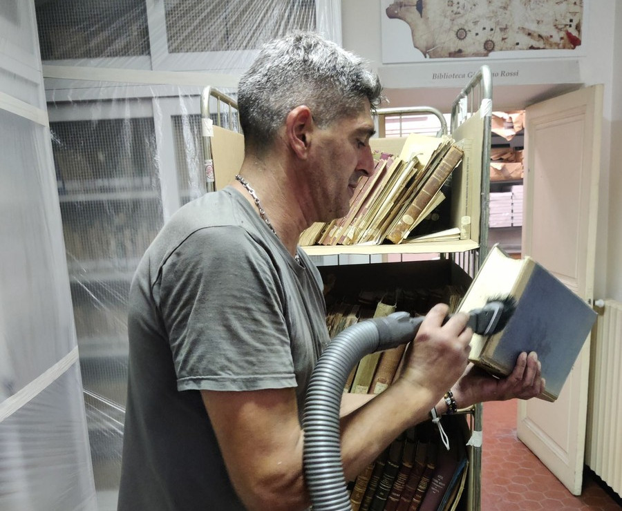 L’intervento, autorizzato e finanziato dalla Soprintendenza Archivistica e Bibliografica della Liguria diretta dalla dott.ssa Francesca Imperiale, è stato realizzato dalla ditta con sede a Cuneo “Colloco”, fornitrice di servizi per archivi e biblioteche di tutta Italia, che garantisce la presenza di operatori specializzati e strumentazione idonea al trattamento del patrimonio bibliografico (pennelli a setole morbide, aspiratori con filtri HEPA e tavoli con cappa aspirante) per rimuovere la polvere accumulata.