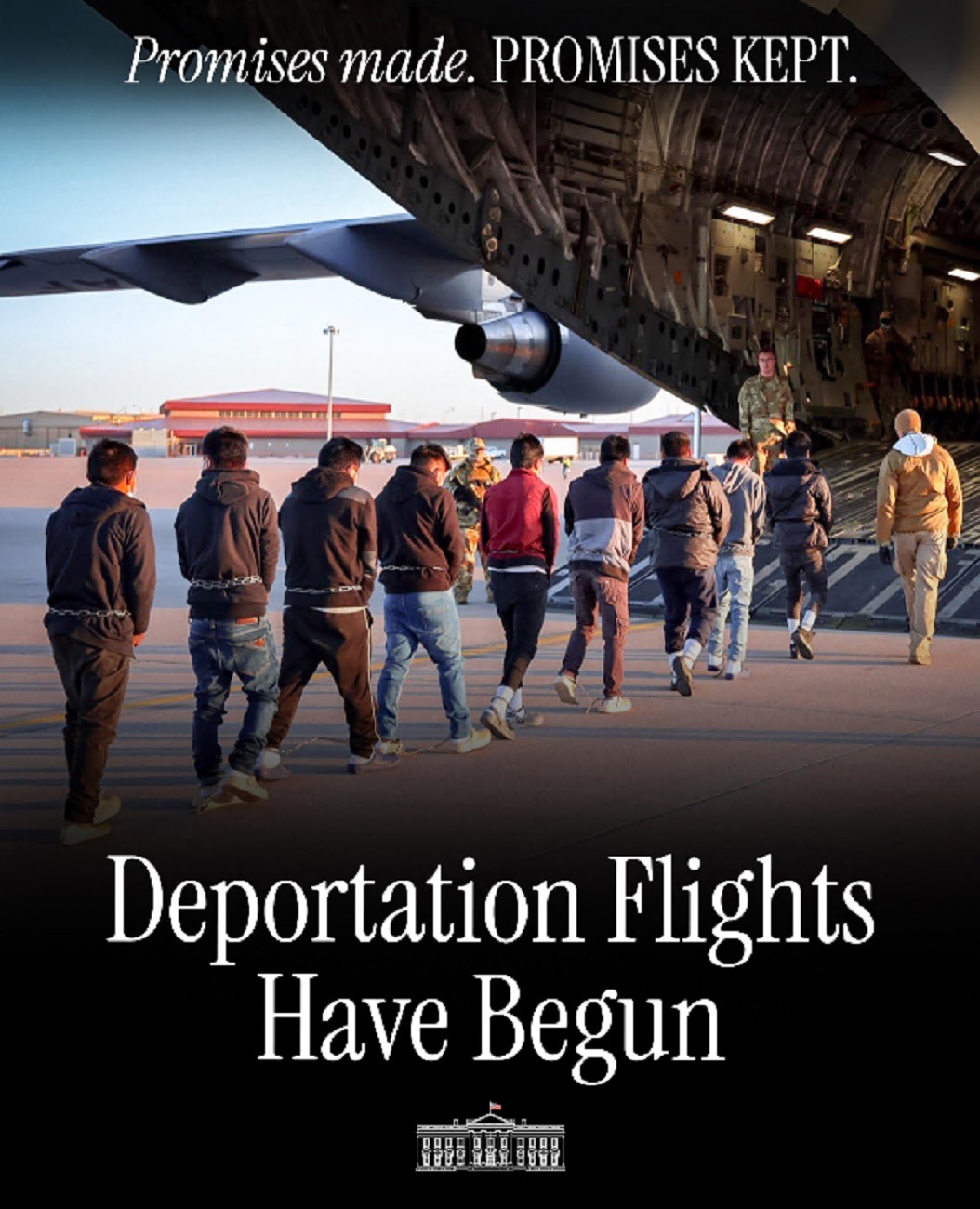 Un gruppo di nove immigrati incatenati condotti da un agente nell’aereo che li rimpatrierà, sopra la scritta “Promesse fatte, promesse mantenute” e sotto, in caratteri più grandi, “i voli per le deportazioni sono iniziati”. E’ l’immagine condivisa dalla Casa Bianca sulle sue reti sociali.