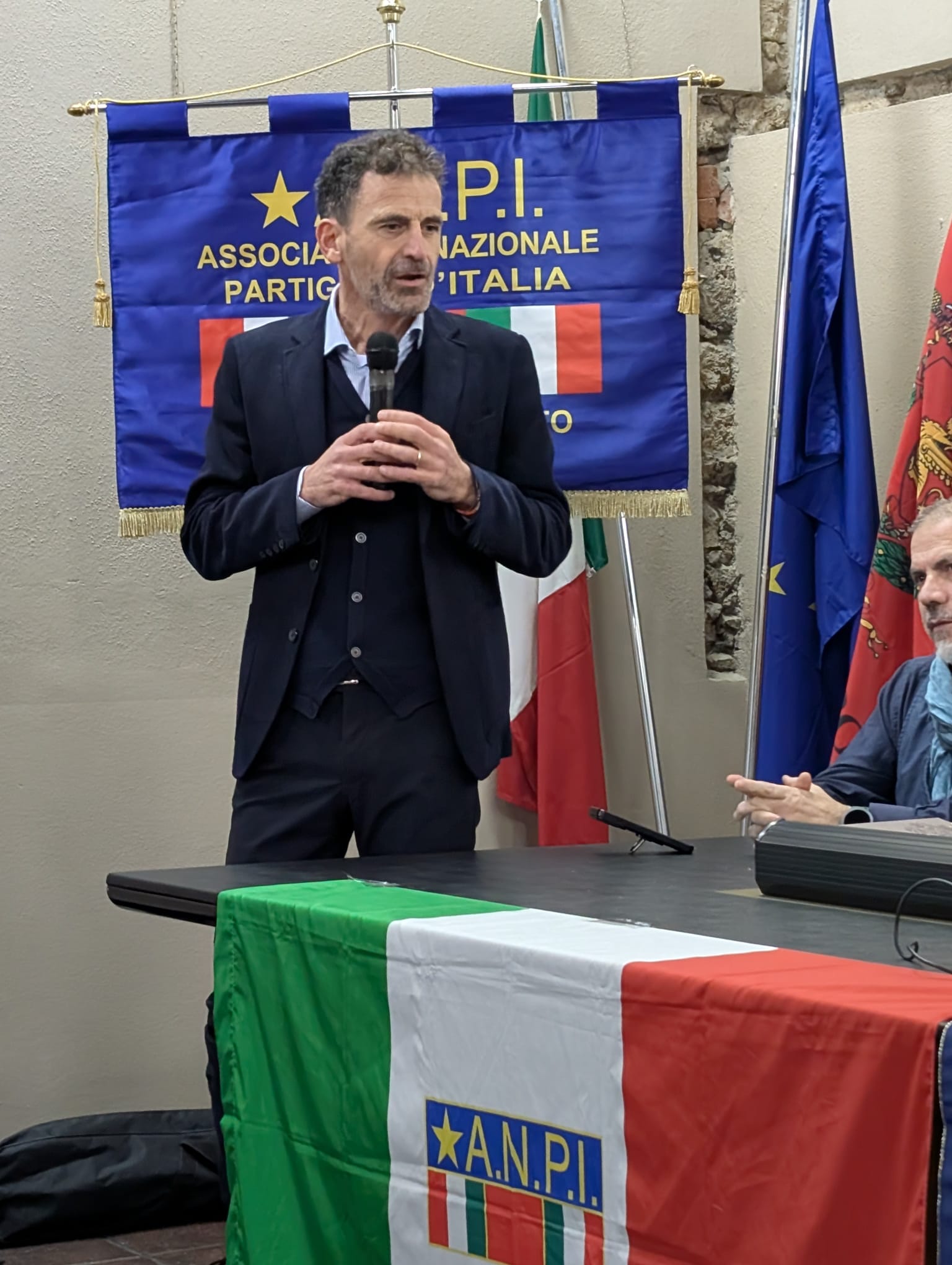 In apertura dell’evento la presidente dell’Anpi di Grosseto, Daniela Castiglione, ha voluto condividere con le iscritte ed agli iscritti un momento importante, sia dal punto di vista umano che sul piano associativo, chiamando al tavolo il signor Piero Vannuccini, figlio del giovane partigiano Armido Vannuccini il cui nome, proprio nell’atrio di Palazzo Aldobrandeschi, è inscritto nel pannello in cristallo insieme ai moltissimi combattenti caduti per la democrazia e la libertà in Maremma.
