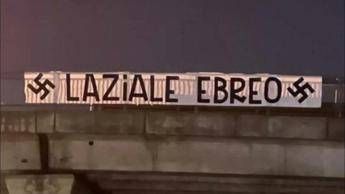 “Laziale ebreo”. E’ la scritta ‘incorniciata’ da due svastiche e messa nero su bianco in uno striscione antisemita appeso nella notte sul cavalcavia della Tangenziale est. Tra poche ore, allo stadio Olimpico, il derby della Capitale.