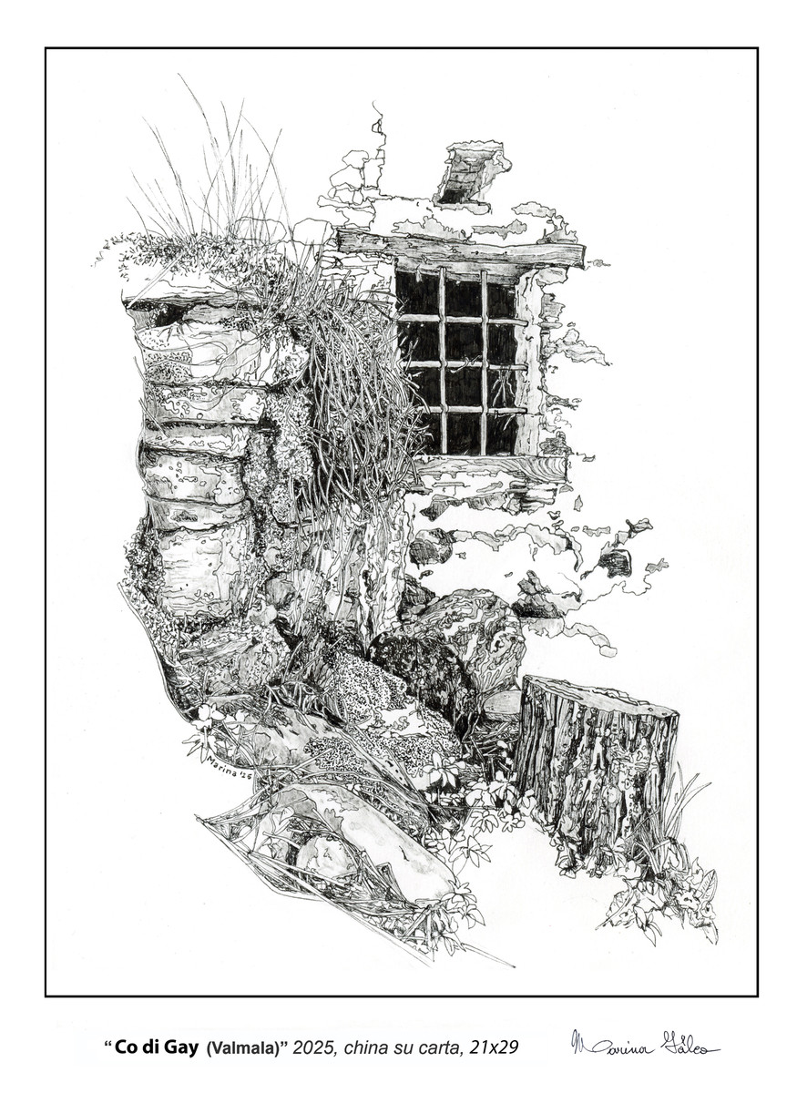 Nuovi luoghi d’ispirazione richiamano l’attenzione dell’artista Marina Falco nella prospettiva di confermare nuovi progetti per la valorizzazione degli aspetti architettonici e culturali legati alla Parrocchia di San Giovanni Battista di Valmala e del Santuario Maria Madre della Misericordia di Valmala che quest’anno rientra nel discorso delle chiese giubilari per la Diocesi di Saluzzo. La collaborazione con lo storico Pierfrancesco Rolando, autore del libro “VALMALA Un paese unico, come la sua storia”, l’ha portata a percorrere questo medievale insediamento alla ricerca di segni di un passato che spesso la natura sta riconquistando.
