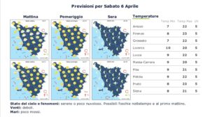 Per sabato 6 aprile generale miglioramento, con venti deboli mari poco mossi e temperature massime oltre i 20 gradi