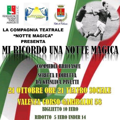 Una commedia brillante scritta e diretta da Gianluca Pivetti della compagnia “Notte Magica”, che riporterà la commedia sul palcoscenico valenzano in occasione del 18° compleanno della figlia: “Rebecca mi ha chiesto come regalo proprio “Mi ricordo una notte magica“, un mio spettacolo del 2002 con numerose repliche e classificatosi al terzo posto al premio Magnoberta nel 2017”.