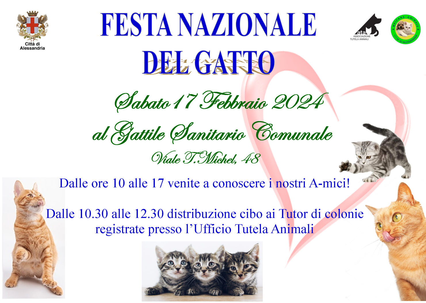 Alessandria rende omaggio al gatto sabato 17 febbraio, con l’apertura straordinaria del Gattile Comunale Sanitario di viale T. Michel 48, dalle ore 10.00 alle 17.00, in occasione della Giornata nazionale del gatto.