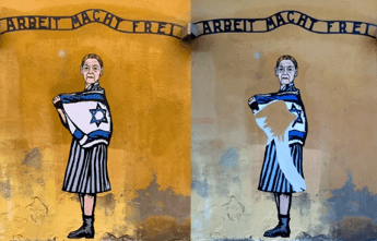 Nella prima opera ‘Arbeit macht frei’ che ritrae Edith Bruck, spiega, la grande stella blu di David è stata rimossa dalla bandiera d’Israele che copre le spalle della scrittrice ungherese, mentre nella seconda opera ‘Halt! Stoj!’ in cui appaiono papa Francesco, Edith Bruck, Liliana Segre e Sami Modiano in versione Simpson nel tipico stile pop dell’artista, sono state sfregiate tutte le stelle di David gialle simbolo di esclusione e sterminio. Mentre sul cartello che indossa il Pontefice è rimasta intatta la scritta ‘Antisemitism is everywhere’, l’antisemitismo è ovunque.