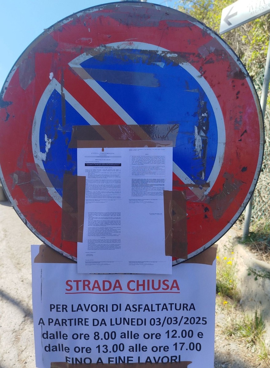 Cambia la viabilità a Ventimiglia. Verrà chiuso al traffico un tratto di via Forte San Paolo e di località Peidaigo per nuovi lavori di asfaltatura.