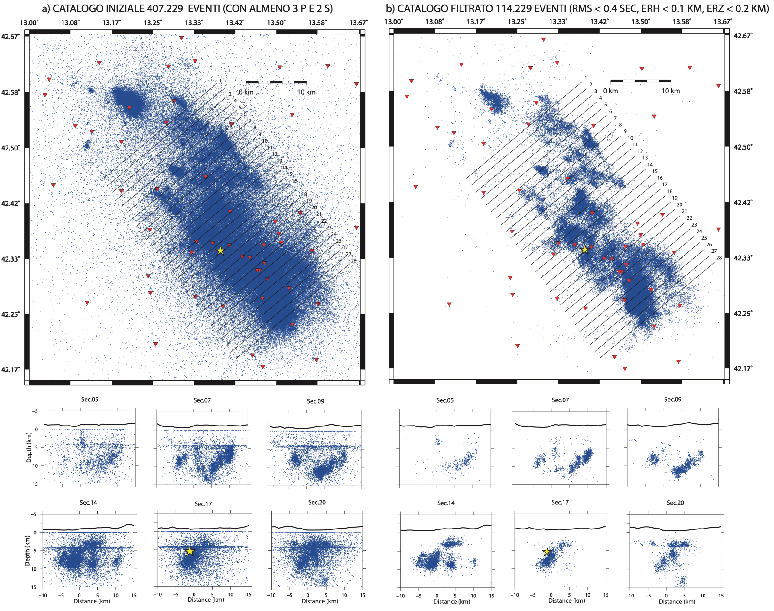Due algoritmi di spicco in questo campo sono PhaseNet e GaMMA, che insieme hanno permesso di elaborare un nuovo catalogo sismico dell’anno 2009, arricchito da circa 114.229 eventi sismici, variabili da magnitudo negativa fino a 5.11. Questo catalogo, grazie alla precisione nel riconoscimento delle onde P ed S, offre una localizzazione degli eventi sismici con margini di errore estremamente ridotti, contribuendo a una migliore comprensione delle faglie attive durante la sequenza.