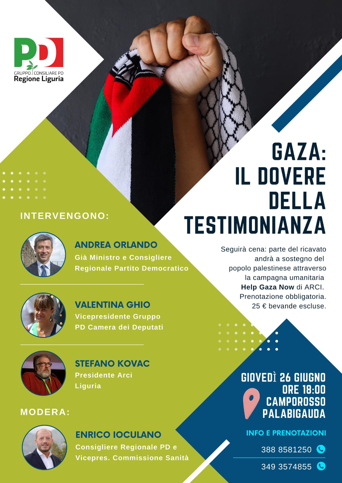Giovedì 26 giugno alle ore 18, presso il PalaBigauda di Camporosso, si terrà un incontro pubblico dal titolo “Gaza: il dovere della testimonianza”, promosso e moderato dal consigliere regionale Enrico Ioculano e dal Gruppo del Partito Democratico della Liguria.