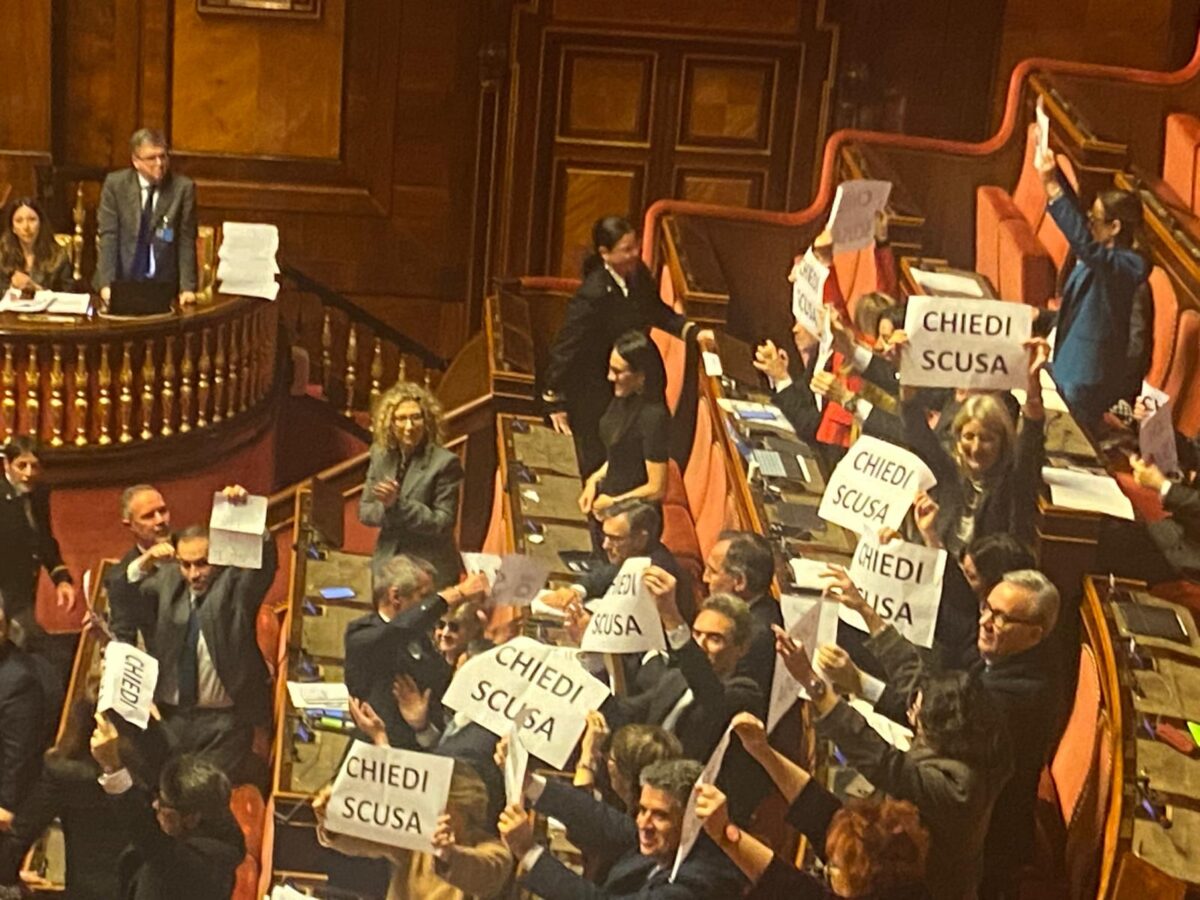 Protesta Pd con cartelli al Senato: “Chiedi scusa”. Renzi attacca: “Tra andare al Viminale e restare al Mit vada a casa”
