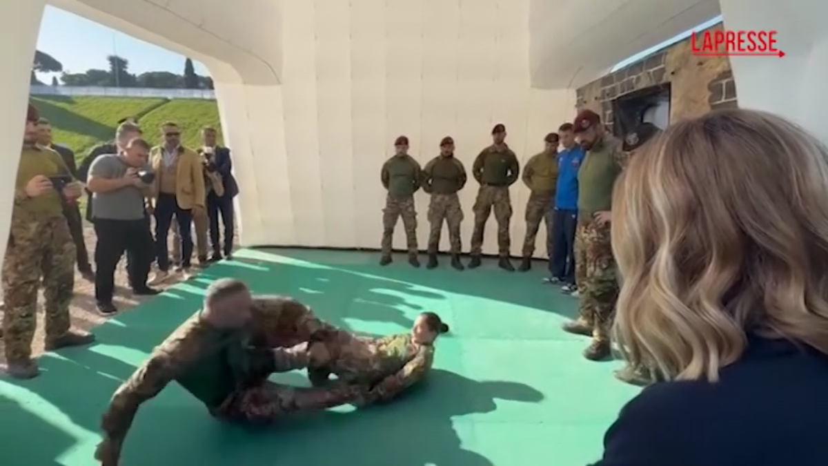 Giorgia Meloni al Villaggio della Difesa, allestito al Circo Massimo in occasione della Festa delle Forze Armate, ha assistito alla dimostrazione del combattimento corpo a corpo.