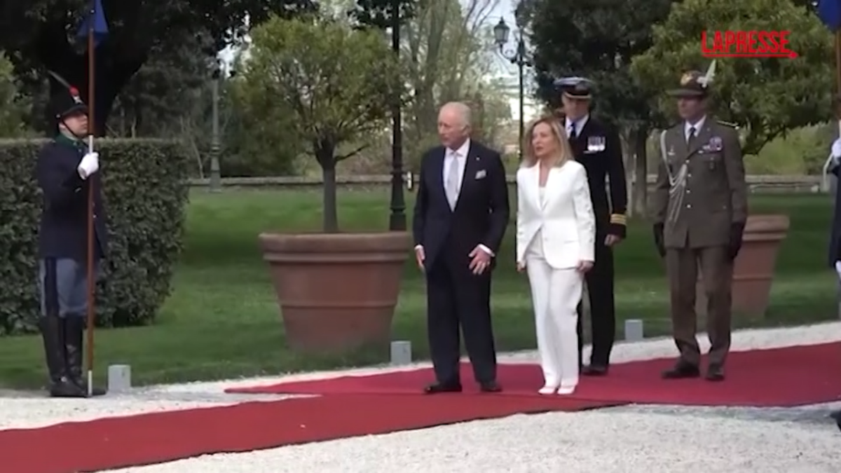 Re Carlo, in visita a Roma con la consorte Regina Camilla, è arrivato a Villa Doria Pamphilj dove è stato accolto dalla premier Giorgia Meloni.